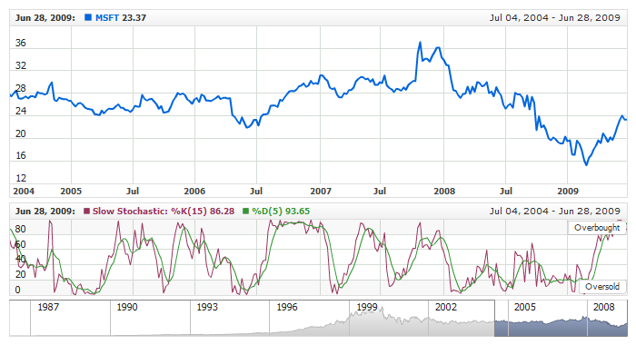 Live sample below shows Stochastic Oscillator with labeled range axis markers used to highlight Overbought and Oversold signals: