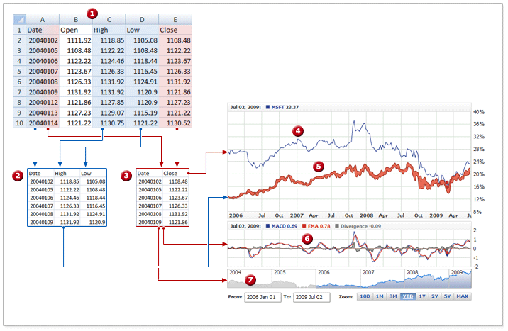 AnyChart Stock Component uses CSV formatted data as a data source. The source can be either an external CSV file, or part of configuration file. In settings you define what columns of CSV table are used and how they are used.
