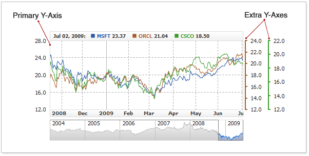 Be default, each chart contains only one Y-axis, the so-called Primary axis; it is positioned on the left edge of the chart, and all series and technical indicators are bound to it. You can also add several extra axes, which in terms of configuration options are similar to Primary axis.