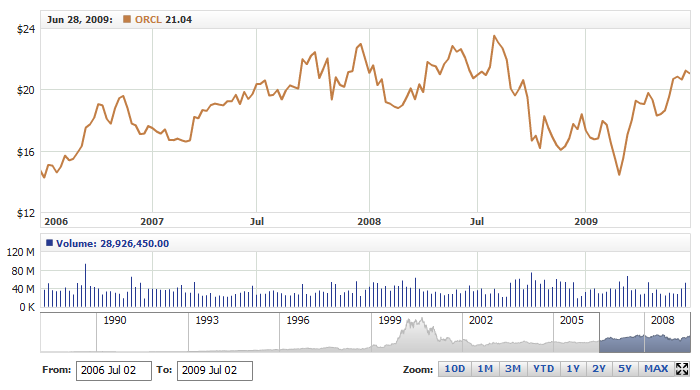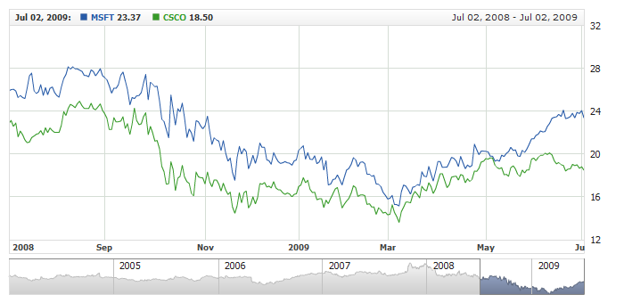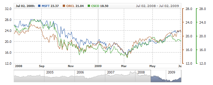 AnyChart Stock supports the logarithmic scale mode and can use it even with negative values, which makes it indispensable when running in the comparison mode.
