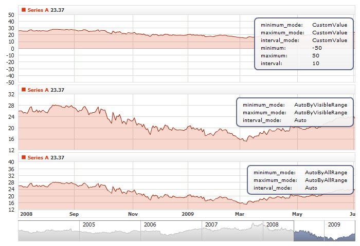 The live sample below shows three charts with the same data series but different scale settings: in the first one, the scale is fixed by the constants, and the interval is defined; the second and the third ones demonstrate different automatic options: