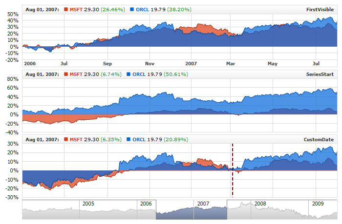This live sample demonstrates all three calculation modes. All of the charts use the same PercentChanges scale mode, but they all have a different comparison base date: