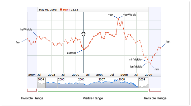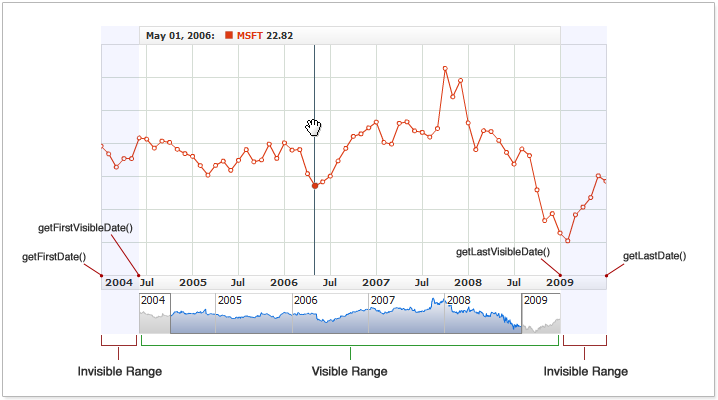 When user interacts with the chart, he can change the visible date time range via dragging the chart, using preset panel, scroller and so on, also, the visible range can be changed programmatically. It may be useful to know what range is shown, as well as have an ability to determine the full date time range of the data shown on the chart