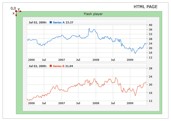 We have intentionally added and marked top and left offsets on the page, so you could see, that these (0,0) points are different. The coordinates are counted top to bottom and left to right both on the page and in the AnyChart Stock Component, as shown below: