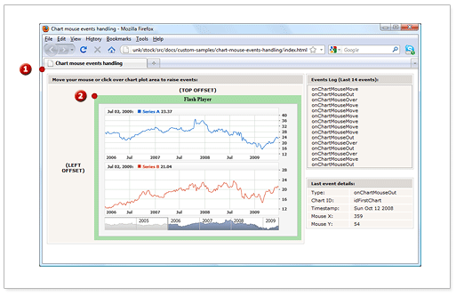 Move mouse over or click chart plot area to fire events. Event details are shown on Event Log table shown to the right of the chart.