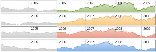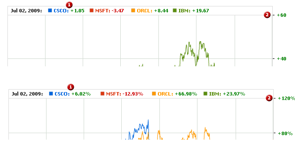 This sample shows how to make chart show so-called comparison chart, rather popular and useful way to show financial data. All controls are custom HTML controls and the chart is controlled using Object Model modifications. Let's see in details what happens here and how it is done: