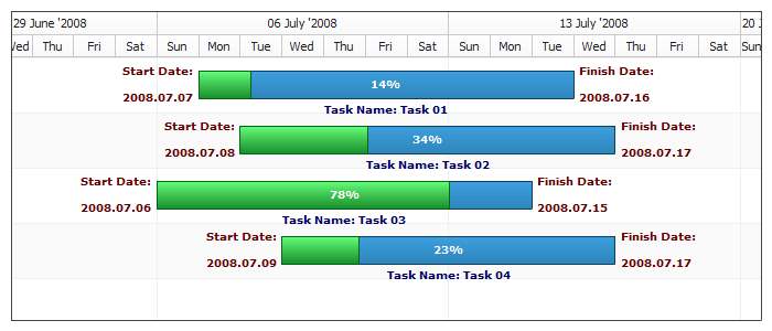 As an example of multiple labels usage let's have a look at a project with some tasks and add four labels with different formatting settings to them: task starting time, task ending time, progress and task name.