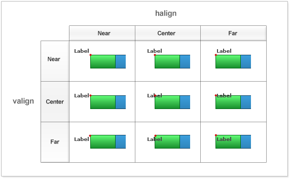 Using halign and valign you can set nine different positions for each anchor point. Table below shows all possible positions with one anchor point: